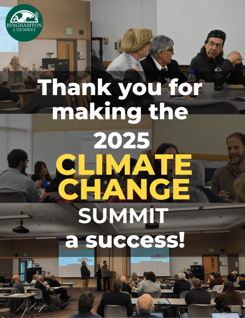 Then this week, we learned that Binghamton 2 Degrees won a Campus Sustainability Award from the Association for Advancement of Sustainability in Higher Education! Congratulations to all involved, most especially Chief Sustainability Officer at Binghamton University, Pamela Mischen, and our own board member, Sustainability Coordinator at Binghamton University, Ancilla Inocencio!